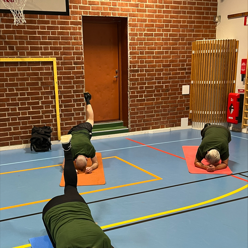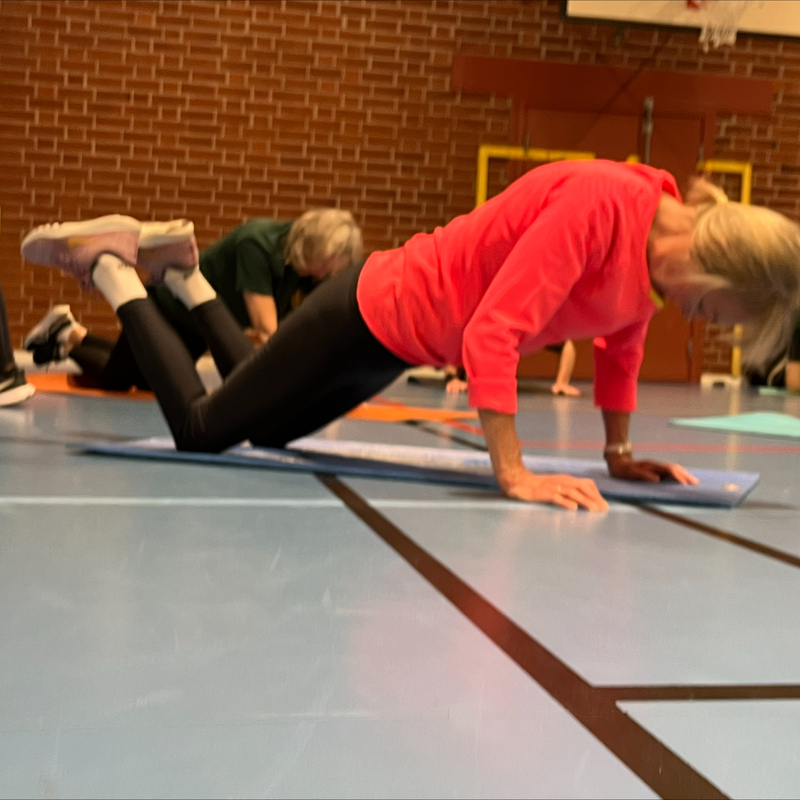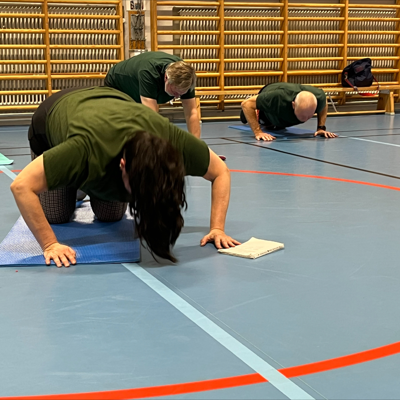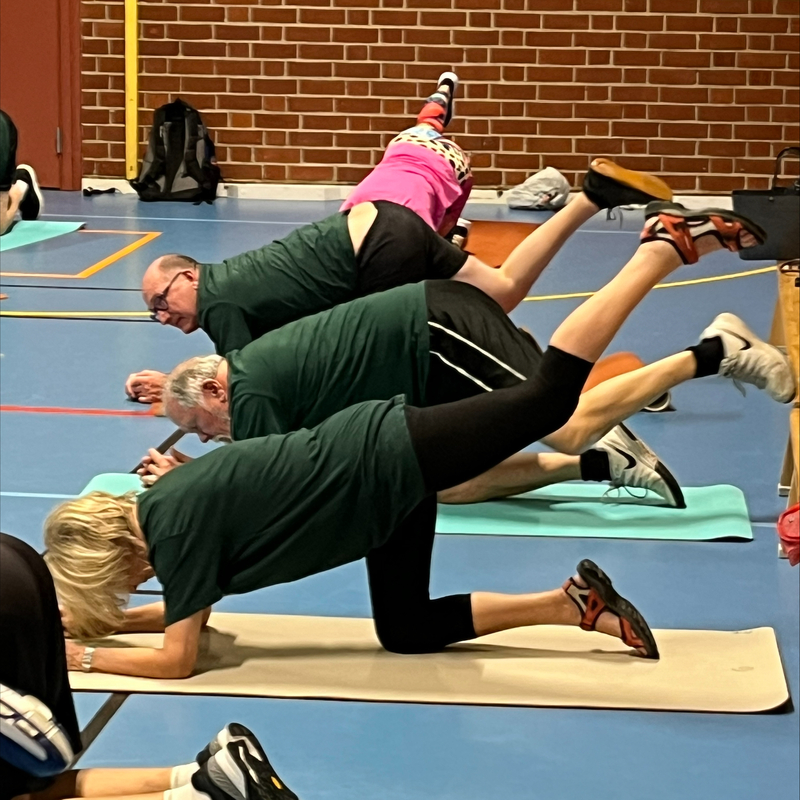 Inget avancerat - bara jättebra gymnastik och stretching under trivsamma former för att hålla oss spänstiga och pigga.